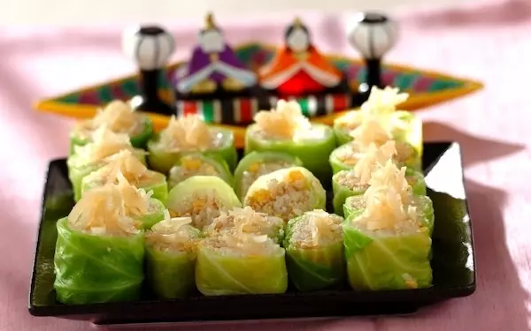 2色のそぼろが入ったお寿司をキャベツで巻いた手軽に作れるレシピです。すぐに食べる場合も、ラップに10分ほど包むとキャベツとそぼろ寿司がなじみやすくなり、まとまります。キャベツの甘みとそぼろの旨味、寿司飯の酸味が混ざり合い、たまらない美味しさです。ひな祭り以外でも、作りたくなるかもしれません。