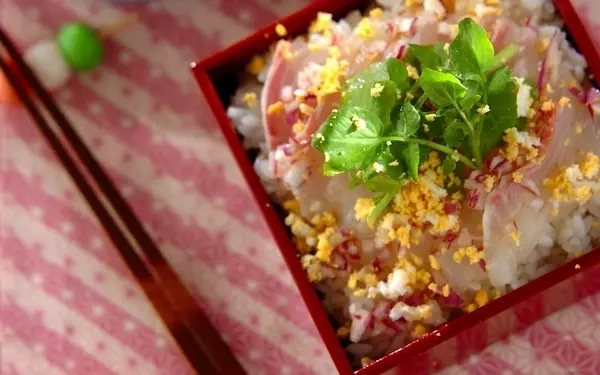 忙しくて料理を作る時間があまりない人にピッタリなのがこちら。鯛のミモザ風ちらし寿司です。作り方は、丼に酢飯をよそい、鯛を並べ、クレソンをのせます。そして、ドレッシングの材料を混ぜてかけ、ゆで卵を散らせば完成です。10分でパパッと作れるのに華やか。ぜひ試してみてくださいね。