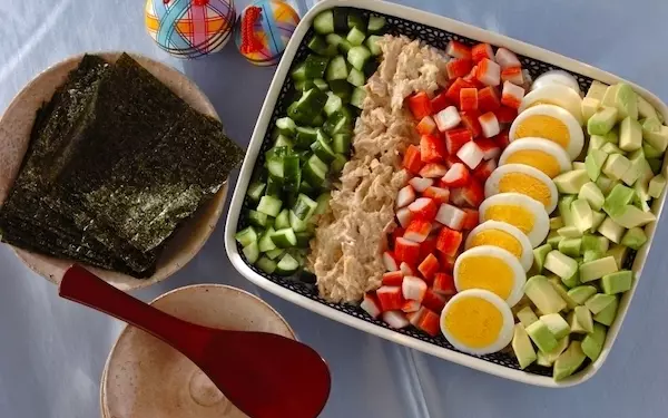 スコップケーキのようなちらし寿司です。食べるときは、手巻き寿司のようにのりで巻きます。アボカド、キュウリ、カニ風味カマボコ、ツナと比較的安価な食材を使って作れるのも魅力。ひな祭りのお助けレシピになりそうです。より華やかに仕上げたい場合は、マグロ、ゆでエビ、サーモンを使って海鮮ちらし寿司にしてもいいでしょう。