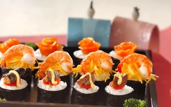 クルクル巻いた寿司に具材をトッピングするだけの、初心者でも失敗しない飾り寿司です。巻きすを使わないのも助かります。こちらのレシピでは、イワシの蒲焼き、錦糸卵とエビ、バラサーモンをトッピングしていますが、この中の2種類もしくは1種類をトッピングするだけでも、もちろん大丈夫です。