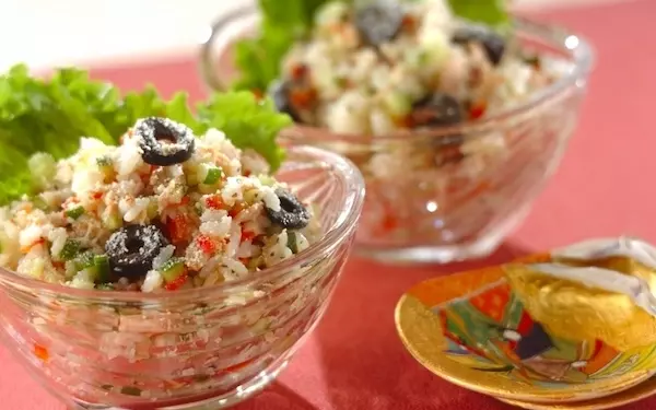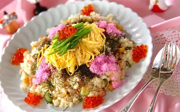 お酒を飲んでひな祭りのお祝いをしたい大人向けのサラダ寿司です。ご飯の量が少ないため、おつまみにピッタリ。また、ご飯はかために炊いたものを使用するのがコツです。そうすることで、野菜や粉チーズとの相性が最高に。ビールや日本酒はもちろん、白ワインやシャンパンとのペアリングもオススメです。