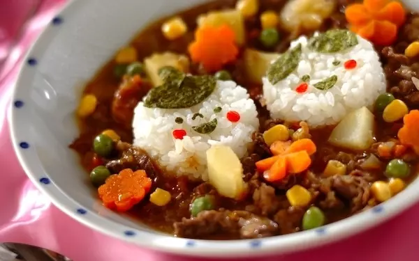 子どもが大好きなカレーは、少しアレンジを加えるだけでひな祭りの主食になります。ご飯に焼きのり、カニ風味カマボコで顔を描くだけでOK。ちらし寿司など少し手間のかかる料理を作る時間がない、今年のひな祭りは違うメニューを作りたい、といったときに最適です。