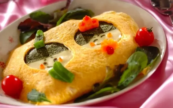お内裏様とお姫様が顔をのぞかせたオムライスです。それぞれの顔の部分は、卵をくり抜き、スライスチーズ・ 焼きのり・ニンジン・キヌサヤなどを使って自由に描きます。子どもと一緒に楽しみながら描いてもいいでしょう。さらにオムライスの周りにベビーリーフやプチトマトを添えると、彩りが良くなりますよ。