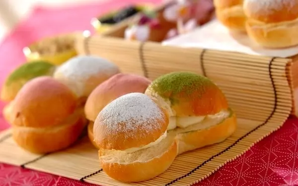 ひな祭りにピッタリな春色パンがこちら。生クリームをサンドしたやさしい甘さがたまりません。塩麹とヨーグルトが隠し味になっています。3個のパンそれぞれに粉糖、抹茶パウダー、フレーズパウダーを振り、色鮮やかに仕上げましょう。桜の花の塩漬けを飾ると、春らしさがアップします。