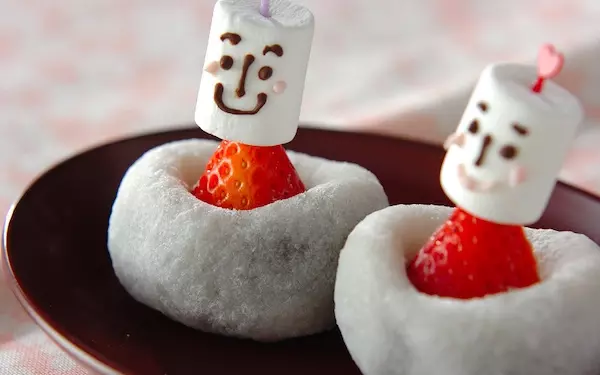 市販の大福餅とマシュマロを組み合わせるだけのお手軽レシピ。大福餅の上部に切り込みを入れ、イチゴの先端が少し出るくらいに大福餅に押し込みます。それから、チョコペンを湯煎で柔らかくし、マシュマロに似顔絵を描きましょう。ピックでマシュマロとイチゴを押し込んだ大福餅を突き刺せばOKです。