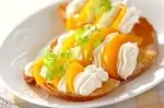 フルーツとホイップクリームを盛ったラスクです。丁寧に盛ることで、カフェのメニューのような見た目に。バケットはトーストするだけでラスクになります。ラスクを多めに作り、チョコレートクリームを塗ったり、黄桃の缶詰の代わりにパイナップルやみかんの缶詰を使っても美味しいです。