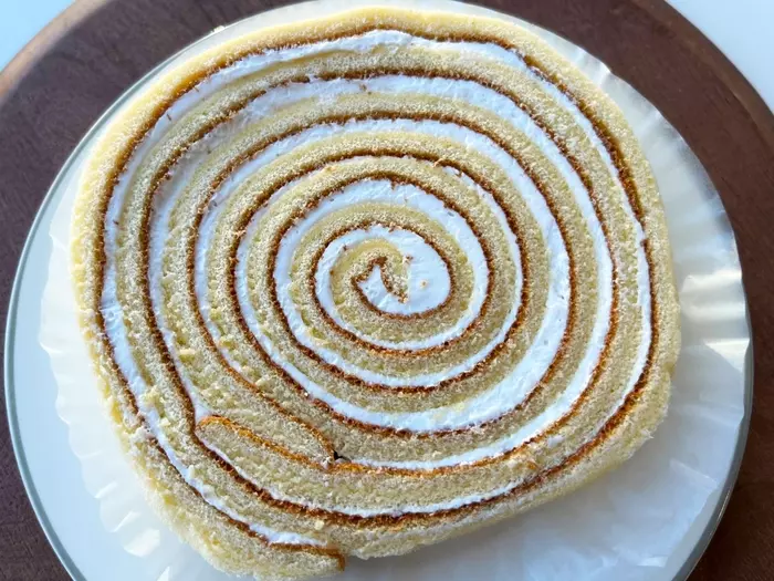ふんわりした生地にミルク味の濃厚クリームがみっちり詰まってぐるぐる巻かれたビッグなロールケーキ。