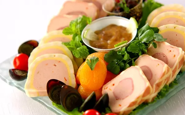 ピータンのほか、テリーヌ、このわた、莫大海などを盛り合わせて豪華なオードブルに。こちらでは、テリーヌは、フォアグラと鴨の2種類、ピータンはうずら卵のピータンを使っています。ホームパーティーや持ち寄りとしても活躍してくれそう。もちろん、全品そろえずに、お好みの何品かを購入して、盛り合わせても◎です。