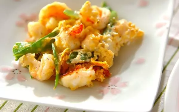 エビとキヌサヤはどちらも歯ごたえの良さが魅力。マヨネーズ入りのふわとろ半熟卵でとじれば、ごちそう感がグーンと高まります。ボリュームもあり、お弁当のメインおかずにイチオシです。
