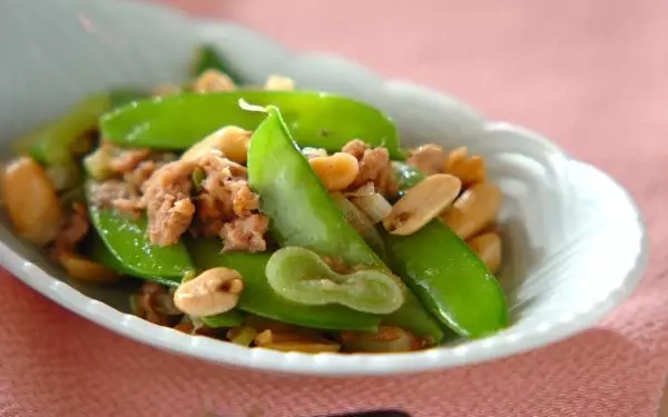 シャキシャキ食感のキヌサヤに、子どもが好きなピーナッツやツナを合わせた塩炒めです。サッと火を通すだけと手早くできるので、あと一品欲しいときに助かります。