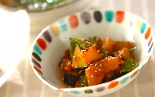 カボチャのオレンジとキヌサヤのグリーンで彩りGOOD! みんなが好きな、コク旨の「みそ×マヨネーズ」です。家にある調味料ですぐに作れますよ。