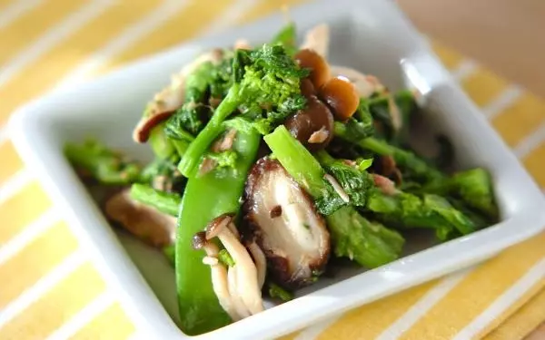 菜の花とキヌサヤをたっぷり使った、春が感じられる一品です。さっぱりとした酢しょう油で和えます。キノコ類やツナの旨味が効いていて、食べやすいです。冷ますと味がなじむため、作り置きも◎。