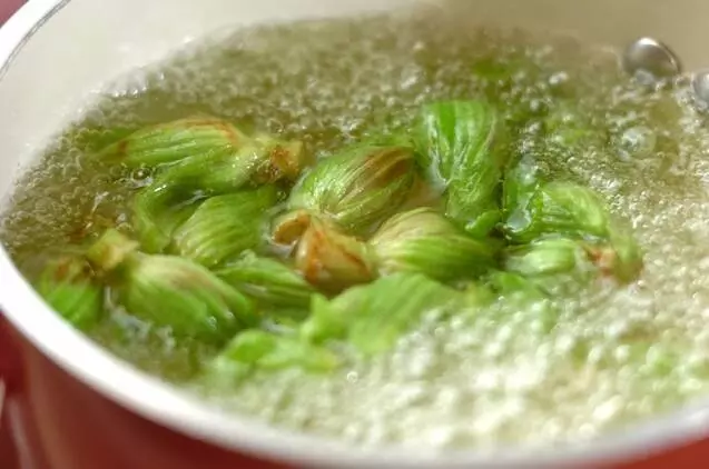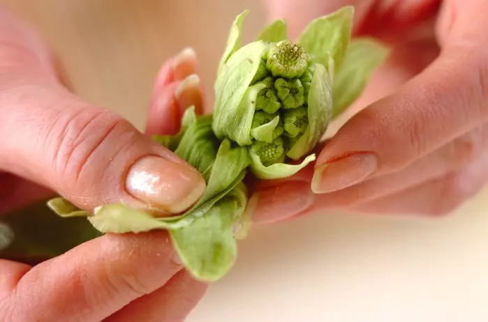 フキノトウはかたい外皮をむき、塩を入れた熱湯で2分ゆでます。(ゆで汁は捨ててください)