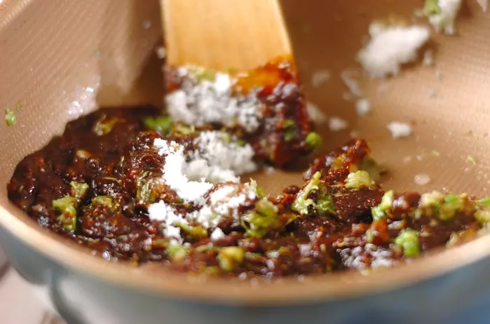 2、弱火で木ベラ等を使ってよく練り合わせ、つやが出てきたら粉かつおを加えて混ぜ合わせる。