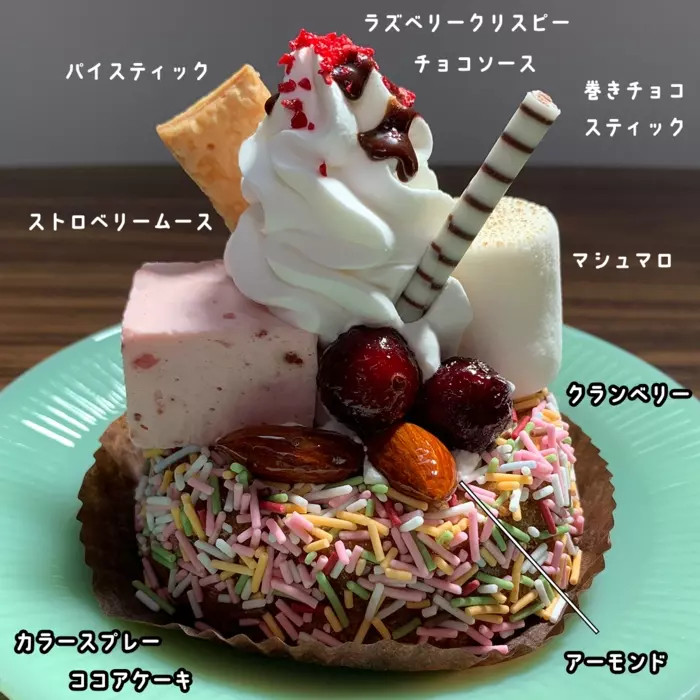なんといっても、マシュマロやチョコスティック、ストロベリームースなど7種類のトッピングが所せましと乗せられた、まるでパフェのようなビジュアルに心が踊ります。ケーキの土台はカラースプレーでデコレーションされたココアケーキ。