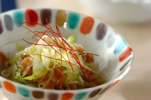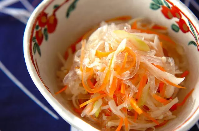 さっぱり食べられる箸休めにピッタリの春雨サラダ。さっとゆでたエノキ、ニンジン、ネギを合わせて甘酢と胡麻油でシンプルな味付けに仕上げます。餃子や焼売などの副菜に◎。