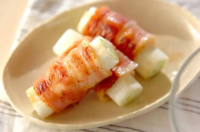 白ワインを入れて蒸すように焼くのがポイントです。白ネギだけでなく青ネギを何本かまとめてベーコンで巻いても良いですね。