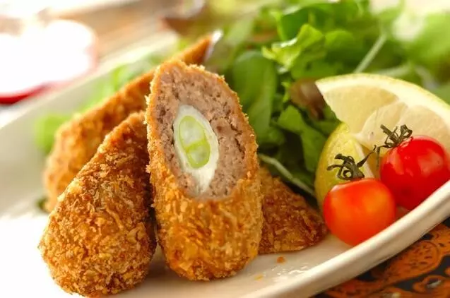 メンチカツの真ん中にネギをドーンと入れました。肉汁を吸ったネギが美味。かさ増しになるのでお財布がピンチな時にオススメです。ごはんに合う一品です。