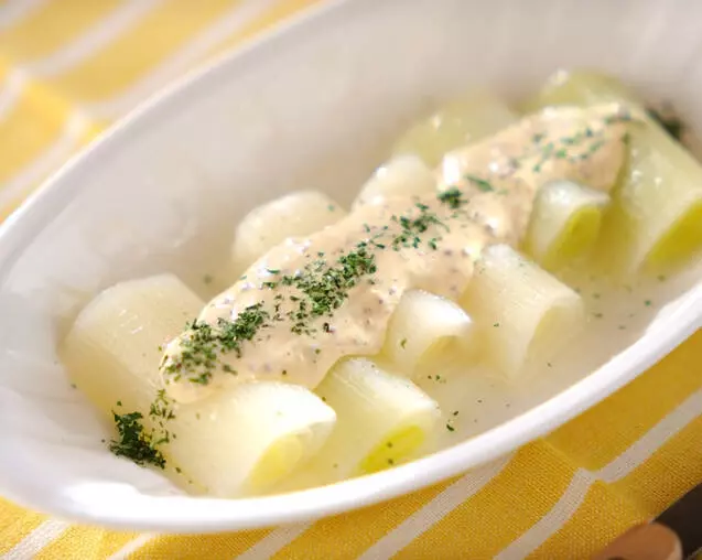 コトコト煮込んだ柔らかい白ネギに酸味が効いたマスタードソースをかけました。白ワインに合うのでパスタの副菜にオススメです。