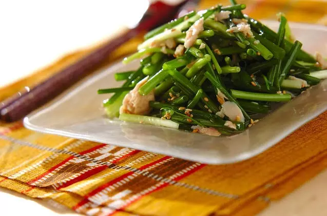 ザーサイがアクセントになったネギのサラダはシャキシャキ食感が味わえます。熱したゴマ油をジュッとまわしかけて香ばしさを楽しみましょう。