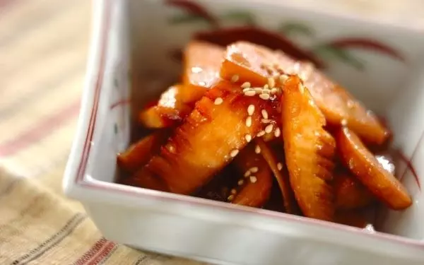 水煮タケノコに蒲焼きのタレをからめたら、チーズをのせて焼くだけ。お弁当のおかずにもピッタリです。蒲焼きのタレは酒・みりん・砂糖・しょう油で簡単に作れますよ。タレの代わりに、みそを塗って焼いてもいいでしょう。