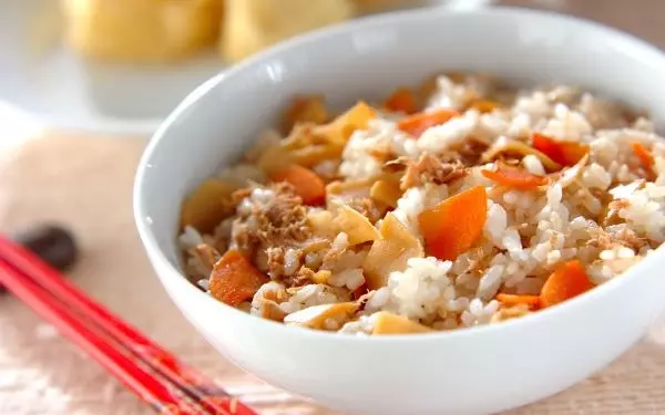 水煮タケノコ、ニンジン、ツナをオイスターソースでじっくり炒めたら、炊きたてのご飯に混ぜるだけ。ツナからいい出汁が出て、簡単に美味しく仕上がります。おにぎりにしてもGOOD。