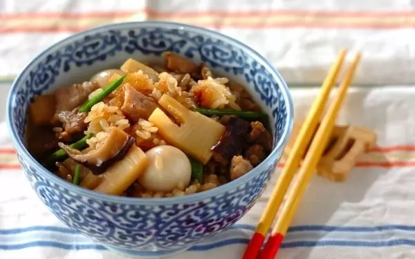 シャキシャキの水煮タケノコとモチモチのご飯がベストマッチ。豚肉、シイタケ、うずらの卵も入れるため、具だんさんで素材の旨味がギュッと詰まっています。冷めてもモチモチなので、お弁当やおにぎりにもおすすめです。