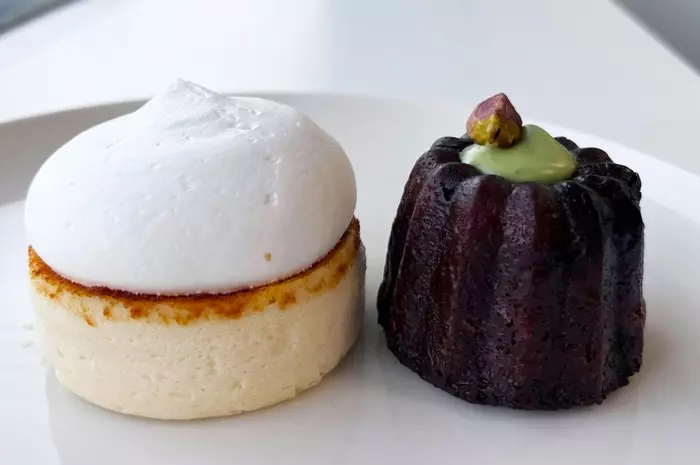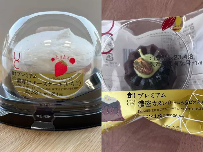 左から、Uchi Café プレミアム濃厚生チーズケーキ(いちご)354円(税込)とUchi Café プレミアム濃密カヌレ(ショコラ&ピスタチオ)268円(税込)