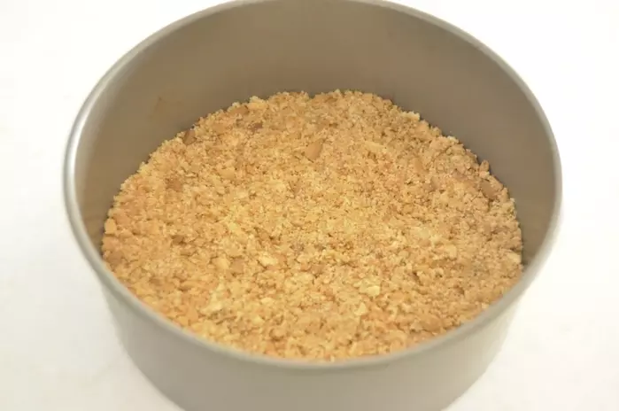 1、<土台>を作る。ビスケットはビニール袋に入れてめん棒等で押さえながら転がし、細かく砕く。無塩バターを耐熱容器に入れてラップをかけ電子レンジで加熱して、砕いたクッキーとしっとりと合わせる。型の底に移し、底をスプーンで押しながらしっかり敷き込み、冷蔵庫で冷やしておく。