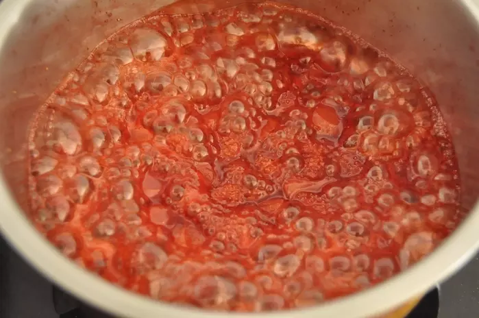 4、<ベリーソース>を作る。全ての材料を鍋で混ぜて30分置く。鍋を中火にかけ、フツフツしてきたら弱火にして鍋に蓋をする。水分が出たら強めの中火にかけ、弱いトロミがついたら火を止めて、容器に移して冷やす。