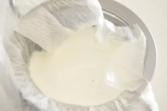 ・ヨーグルトはキッチンペーパーをのせたザルに入れて半日冷蔵庫に入れ、100gまで水きりする。100gより少なければ水きりした水分で調整する。