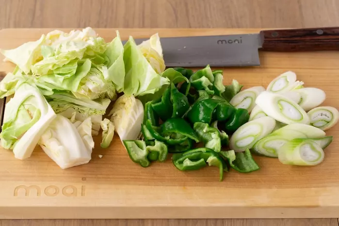 ・キャベツ、ピーマンは一口大に切る。白ネギは斜め切りする。