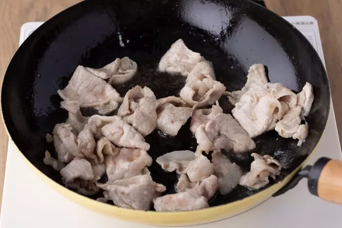 フライパンでごま油を中火で熱し、豚肉を炒める。
