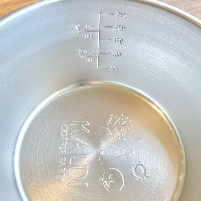 シェラカップは、器にしたりクッカーとして活躍したり、キャンプや登山などで便利に使えるアイテムです。内側には便利な目盛り付き。50~250mlまでの目盛りと、0.5~1合の目盛りがあり、液体だけでなく、お米も量れる優れもの。満水時容量は320mlです。