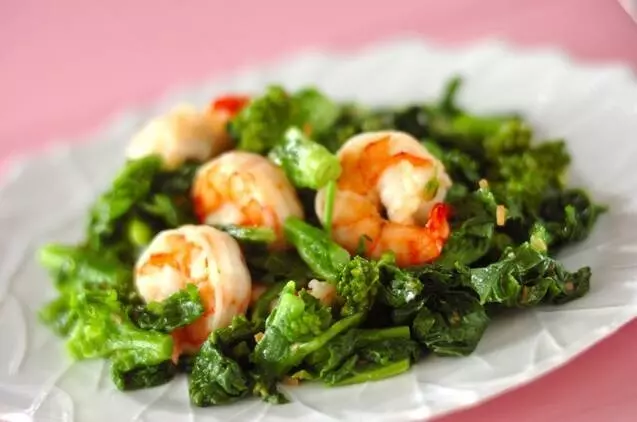 菜の花の香りに、ピリッとした風味がアクセント。エビのプリプリ食感が味わえるおつまみにもおすすめの一品です。