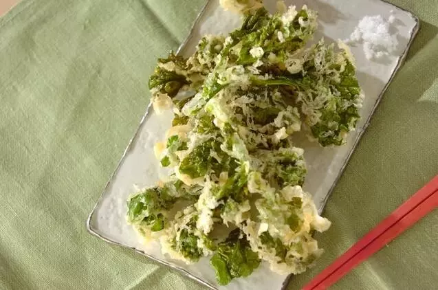サクサクに揚がった天ぷらは絶品です。揚げることで菜の花のほろ苦さが和らぎますよ。塩をつけて日本酒のお供にいかがですか?