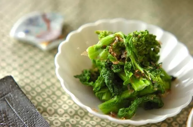 菜の花の苦味が苦手な方向けに、かつお節をまぶしました。手早くできるのであと一品ほしい時にピッタリです。