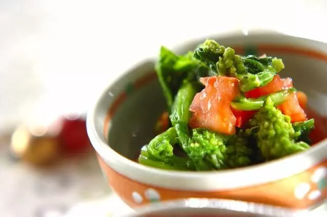 春の定番菜の花のからし和えにプチトマトの酸味をプラス。市販の麺つゆを使って簡単に。