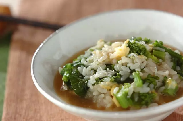 菜の花の色が鮮やかになったら火を止め、器に注ぎ入れ、ぶぶあられを散らします。菜の花を食べて春を感じましょう。