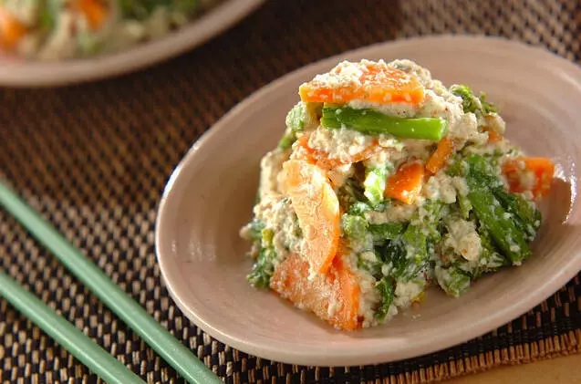 女性のからだに必要な栄養素たっぷりの菜の花入りの白和えです。旬の時期にしっかり食べておきましょう。