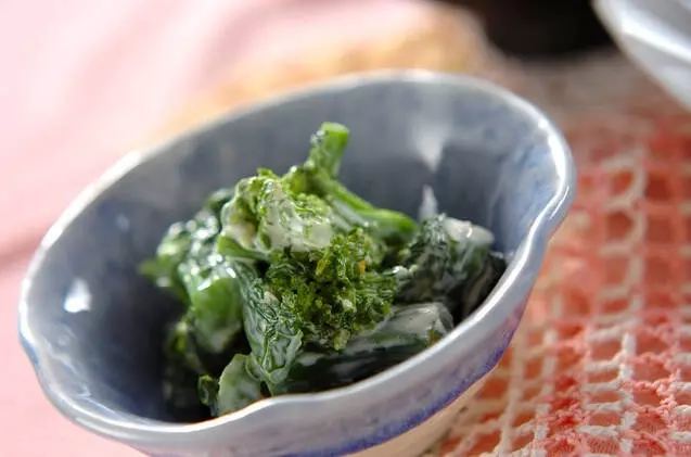 マヨネーズにプレーンヨーグルトをプラスしてワサビで刺激をプラスしました。菜の花の苦みが味わえる一品です。