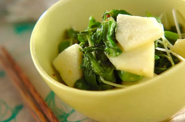 菜の花とリンゴはビタミンたっぷりの組み合わせ。粒マスタードをきかせたドレッシングをかけて召し上がれ。