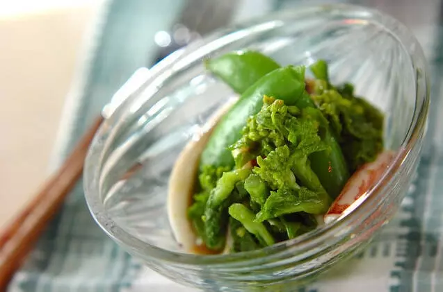 チクワ入りで菜の花の苦みがアクセントの和え物です。菜の花はゆですぎに注意しましょう。