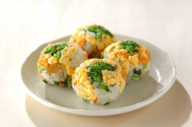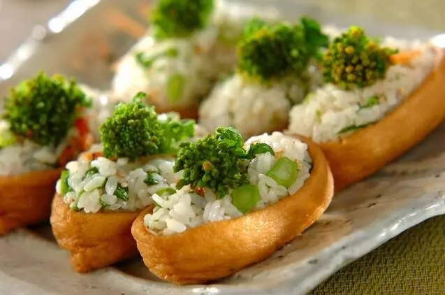 菜の花独特の風味と干しエビの香ばしさがおいしい春のいなり寿司。オープンタイプのいなり寿司は華やかで、おもてなしやお弁当にも良いですね。