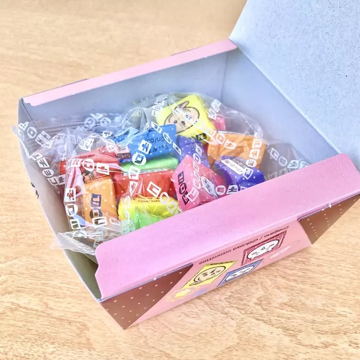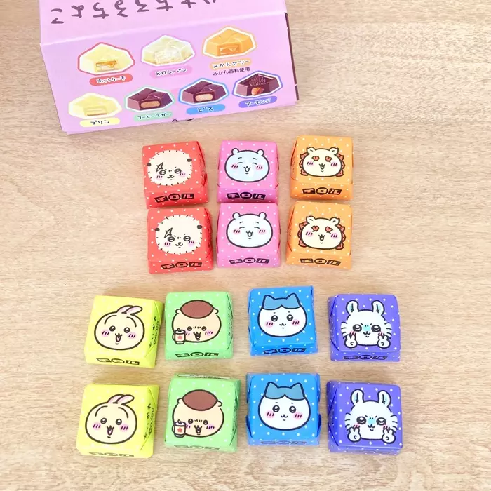 「ちいかわ」とチロルチョコがコラボ!ホットケーキ、メロンパン、みかんゼリー、プリン、コーヒーヌガー、ビス、アーモンドの7種の味が楽しめる商品です。個包装それぞれにちいかわたちがデザインされたチロルチョコが各キャラ(味)2個ずつ、計14個入っています。BOXデザインはちいかわ・ハチワレ・うさぎの全3種類。