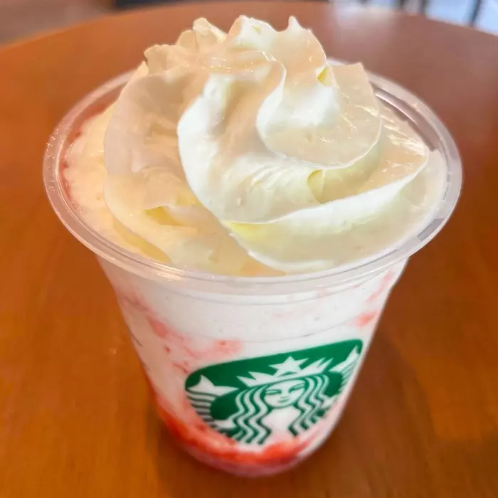 ストロベリーソースの甘酸っぱくてツブツブ食感の果実感に、ミルクのコクが混ざり合う鮮やかなフラペチーノ。イチゴがまるごと入ってるかのような濃いイチゴの味は本場の「ストロベリー&クリーム」ってこんな感じかと妄想が膨らみます。最後には思い切り混ぜてミルキーに楽しむのがオススメです。