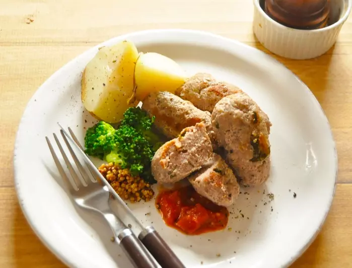 4、ソーセージをラップから外してアルミホイルにのせて、オーブントースターで焼いて器に盛る。お好みで粒マスタードやチャップを添え、ブロッコリーやジャガイモなどの付け合わせの野菜を添える。