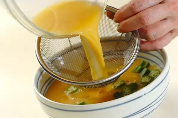 2、耐熱の器にツナとオクラを入れ、(1)を網を通して注ぎ入れラップをかける。