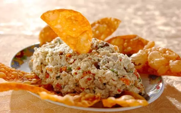 パリパリに揚げた餃子の皮に、中華風の白和えをのせていただきます。ゴマ油が香るしっかりめの味つけなので、おつまみに最適。豆腐の水気をしっかり切ることが、味をぼやけさせない秘訣です。