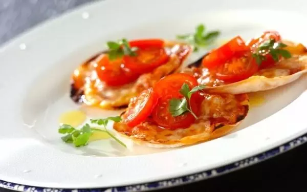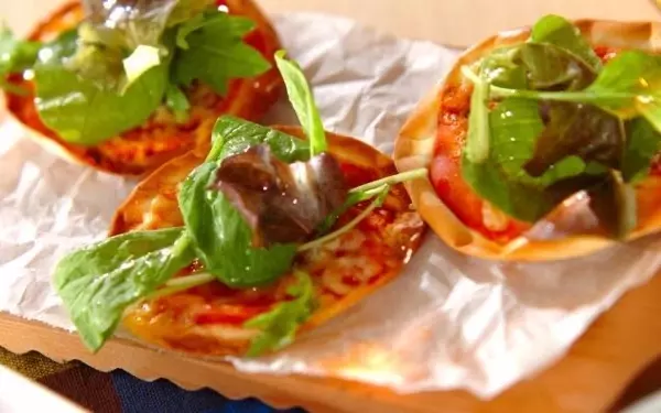 餃子の皮にトマトピューレとアンチョビをのせて焼き、フレッシュなベビーリーフをトッピング。トマトの赤とベビーリーフの緑のコントラストがとっても鮮やかで、パーティーの一品にも◎です。